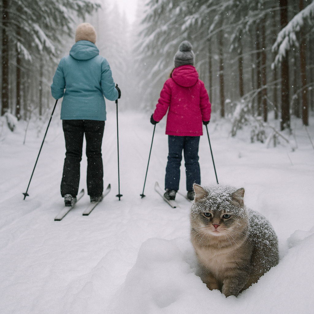 Снег прекратился, на смену ему пришел морозец, ощутимый на щеках и пальцах, несмотря на утеплённые перчатки. Тем временем Пушок выбивался из последних сил. Ему уже казалось, что это конец: идти было почти невозможно, лапы ныли, тело зябло, а пустой желудок сжимался всё сильнее. Он вывалился на лыжню и сдавленно мяукнул — это был не зов, а настоящий стон.
