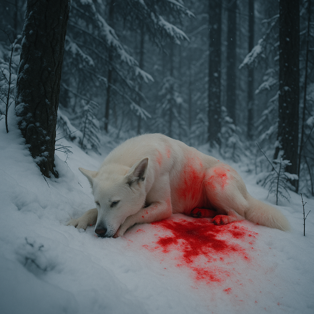 Сквозь снег они заметили силуэт. По склону медленно спускалась Белка. Белая шерсть делала её почти незаметной, если бы не живот, залитый алым. Она едва держалась на лапах: пройдя несколько шагов, падала, поднималась вновь и, подвывая, пыталась двигаться дальше. Уже не шла — ползла.