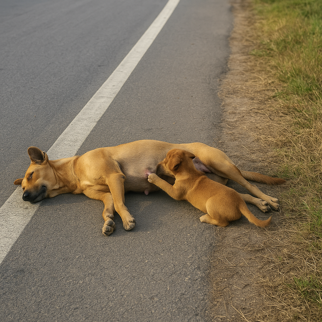 Олег, нарушая правила, развернулся. Проехав немного, они заметили на дороге страшную картину. На тёмном пятне асфальта лежала погибшая под колёсами собака, а рядом с ней — крошечный чёрный комочек, жалкий щенок, который из последних сил пытался утянуть мать с дороги. Слабенькие лапки дрожали, глаза были полны отчаяния. Вокруг кружили вороны, ожидая, когда можно будет приблизиться.