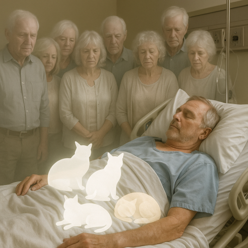 И вдруг рядом с ним появились три знакомых тени — его кошки. Три верные души, что когда-то ждали его дома. Они подошли, потерлись о ноги, тихо замурлыкали. Он улыбнулся, наклонился, погладил каждую и прошептал: