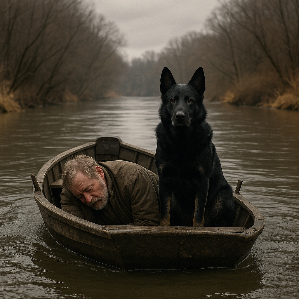 На реке дрейфовала лодка. Без вёсел. Внутри, завалившись на борт, сидел человек. А рядом, не умолкая, надсадно лаял огромный черный пёс.