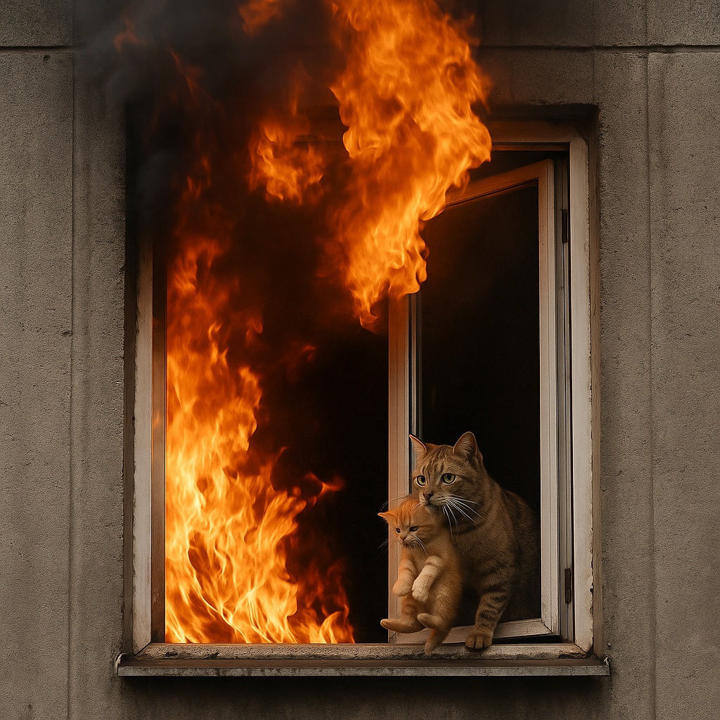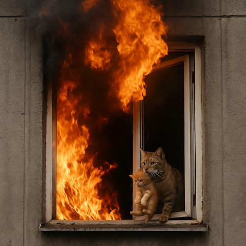 Сестра, затаив дыхание, наблюдала за братьями. Вдруг, в окне на верхнем этаже, она заметила движение. Присмотревшись, увидела кошку, зажатую на подоконнике. В зубах она держала котёнка, а рядом жались ещё малыши. Хозяева, спасаясь, просто оставили их внутри.