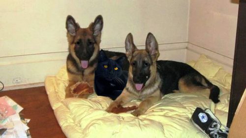Теперь старый, большой, чёрный кот каждую ночь спит между двумя рослыми, красивыми, умными овчарками. Они всегда устраиваются по обе стороны от него, чтобы согреть теплом своих крупных тел своего настоящего папочку.