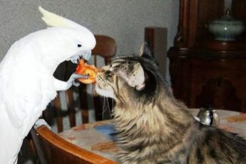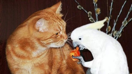 Кот и какаду внезапно выскочили из-под стола и закружились в забавной игре, гоняясь друг за другом. Они нашли общий язык и вскоре сидели рядышком на подоконнике, рассматривая город внизу.
