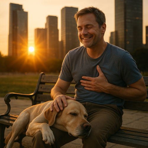 Солнце садилось за небоскрёбы и отражалось последними лучами в стёклах, пуская зайчиков. Мужчина сел на скамейку, а его Джек улегся рядом, положив голову на колени. Человек посмотрел на заходящее солнце и погладил свою собаку. Он улыбался. Потом вздохнул полной грудью и почувствовал резкую боль под левой лопаткой…