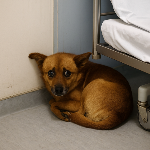 В углу, сжавшись в маленький дрожащий комочек, лежала рыжая собака. Глаза её были переполнены ужасом. Как она сюда проникла — загадка. Как нашла своего человека — вообще тайна.