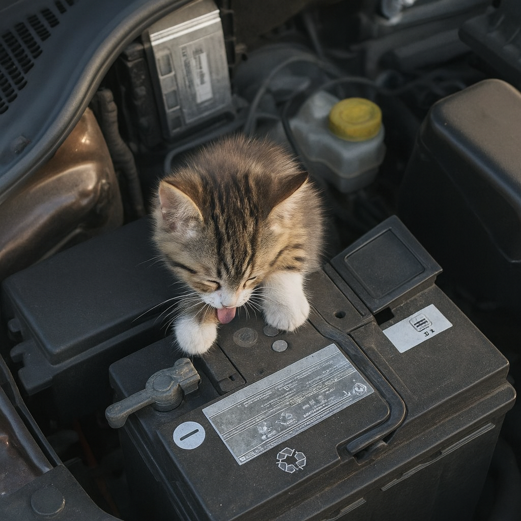 Да, сомнений быть не могло — в нутре машины прятался котёнок. Видимо, влез на работе в теплый моторный отсек — и ехал всю дорогу.