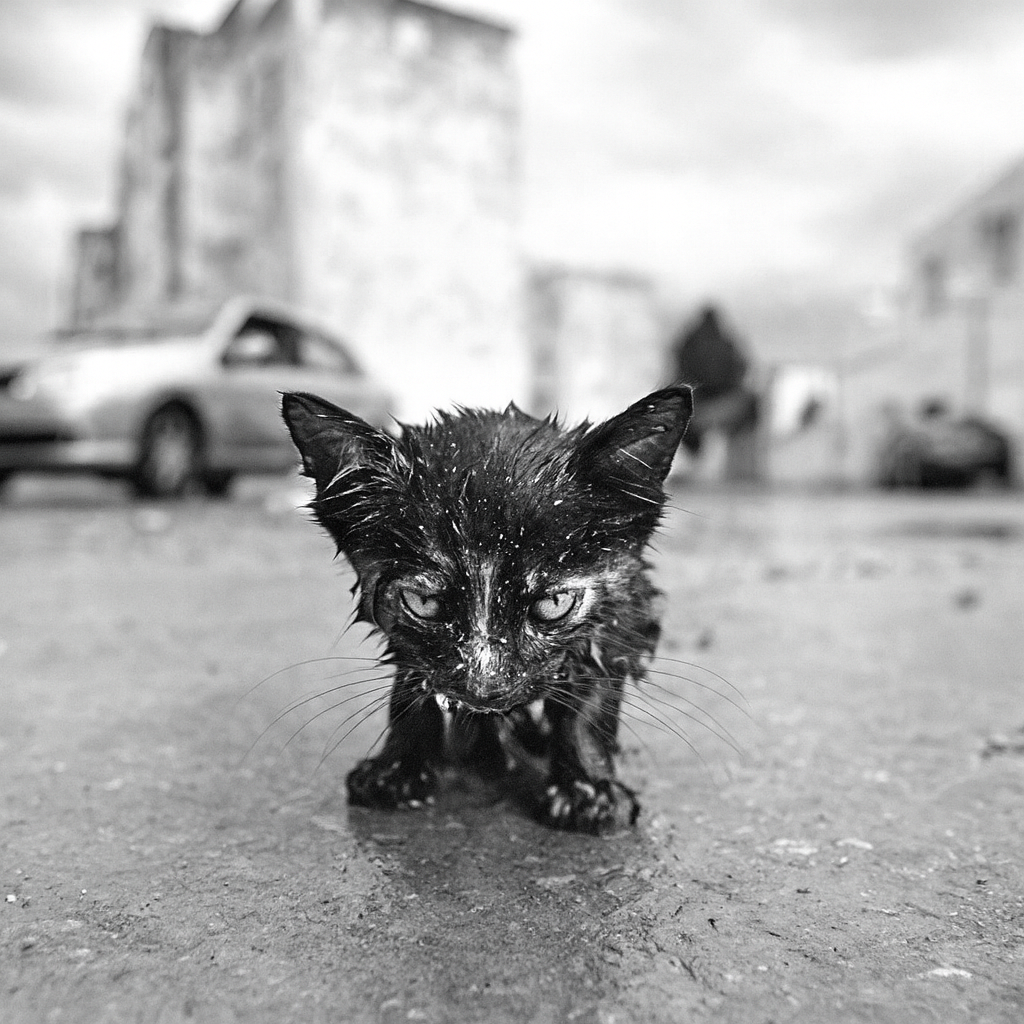 Мужчина нагнулся и поднял маленькое промокшее существо. Придвинул к лицу. Котёнок увидел его большие глаза и жалобно пикнул. Он просто просил. Без ожидания, без уверенности. Наугад. Хоть бы покормили…