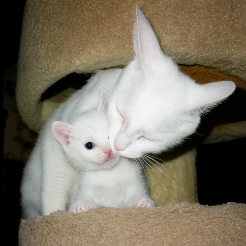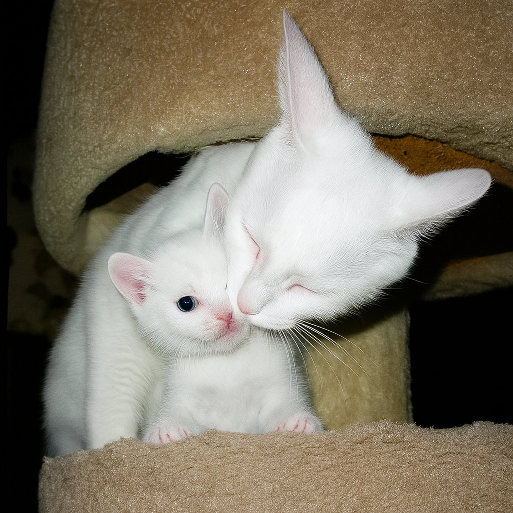 Оказавшись дома, он внимательно рассмотрел найденышей. Перед ним сидела кошка с красивой длинной белой шерстью. К ней жался крошечный белоснежный комочек — худенький котёнок. Оба промокшие насквозь, дрожащие, они оставляли лужу на полу в прихожей.