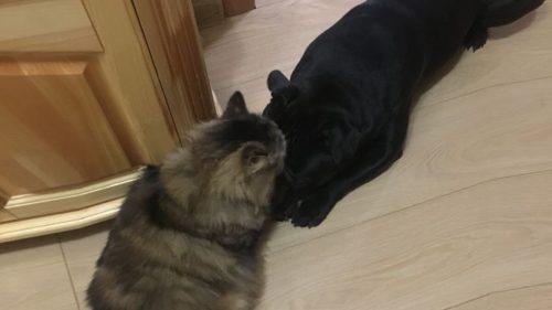 Обычно мягкий нравом кот внезапно отвесил щенку хлёсткую оплеуху. Хотел было добавить ещё, но вмешались хозяева: