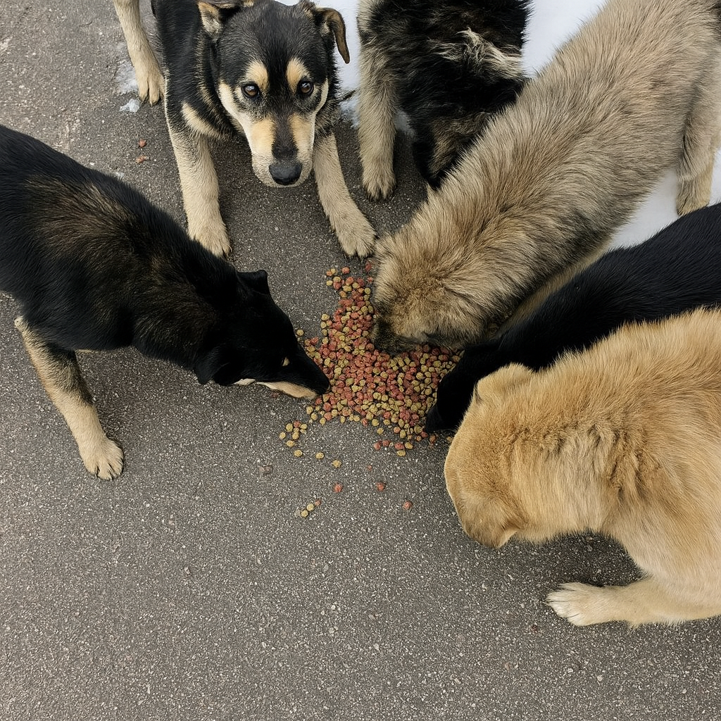 Он остановился у угла, осторожно выглянул — и в этот момент из тени, словно из ниоткуда, к пацанам метнулись десятки кошек и несколько собак. Мальчишки быстро открывали банки, вытаскивали сухие корма и раскладывали их пушистым и хвостатым голодранцам.