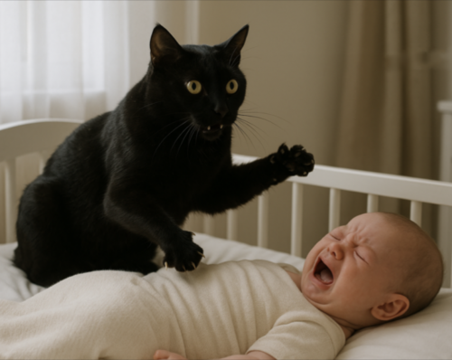 В кадре шестимесячный Толик мирно спал в кроватке. На верхней планке бортика, прямо над ним, сидела домашняя чёрная кошка Анфиска. И вдруг она не просто спрыгнула вниз. Она сорвалась, как чёрная искра, как молния — резко и точно. Приземлилась прямо на грудь спящего ребёнка. Кошка зашипела, затряслась всем телом, начала бешено молотить лапами, и в камере блеснули когти — так, будто она бросилась на лицо младенца.
