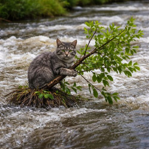 Докуривая сигарету, Михаил вдруг заметил движение среди ветвей. Кто-то отчаянно карабкался вверх. Он прищурился… Кот. Или кошка. Молча, цепляясь когтями, существо пыталось выбраться повыше. Но выше было уже некуда. Кот замер на самой верхней ветке, всего в метре над водой, а вокруг — река. До любого берега не меньше двадцати метров.