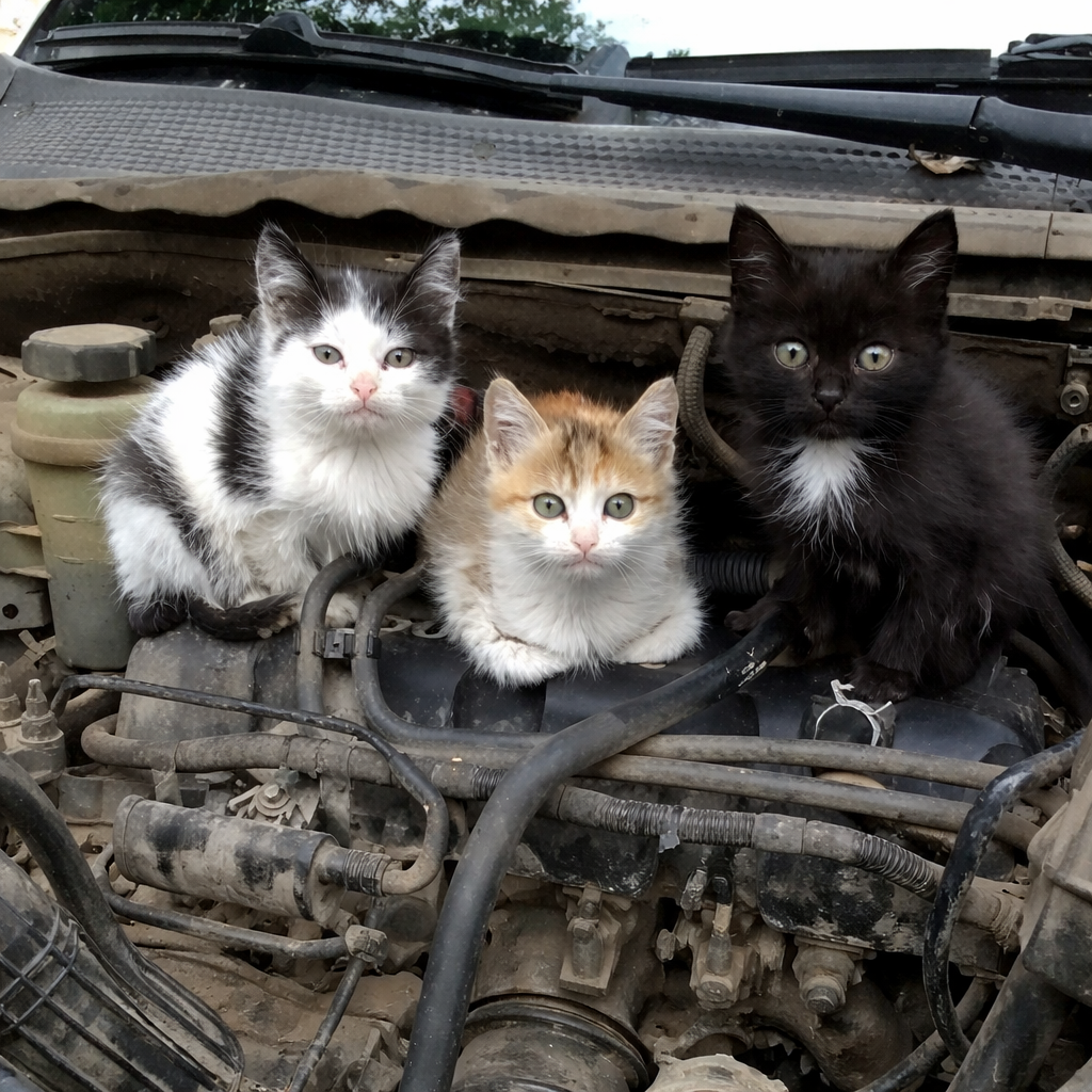 Будто ремень начал свистеть или вентилятор что-то задел — хотя машина была выключена. Вздохнув и бросив взгляд на остальных водителей, которые уже удобно расселись за обедом, он решил проверить. Поднял капот — и едва не лишился дара речи. На крышке вентилятора, прямо рядом с решёткой охлаждения, сидел крошечный черный котёнок, перепачканный маслом, и жалобно пищал.
