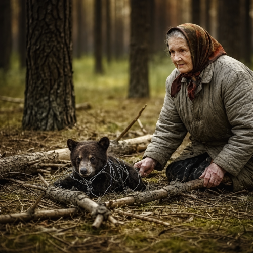 Она вставила палку между дугами капкана и навалилась всем весом. Дерево затрещало, но железо не поддалось. Она переставила ноги, упёрлась, чувствуя, как дрожат старые мышцы спины и рук. Рывок. Ещё. Раздался скрежет, и челюсти ловушки разошлись на считанные сантиметры. Медвежонок дёрнулся, но она крикнула: «Стой!» — и он замер, лишь тонко взвизгнув от боли.