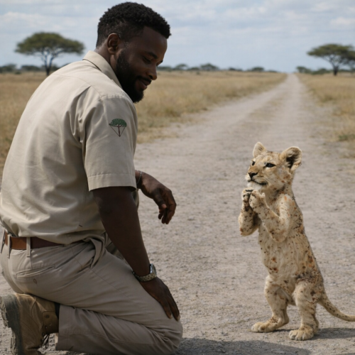 Всего в нескольких шагах от бампера я увидел маленького львёнка. Он не пытался убежать. Встав на задние лапы и неловко удерживая равновесие, он тянулся вперёд и смотрел прямо на меня — не по-детски отчаянно, так, что по коже пробежал холод. В его взгляде не было страха, только мольба. Он явно звал меня за собой.