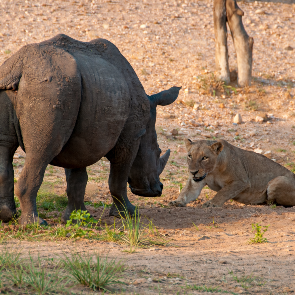 Носорог уже собирался идти на львицу, но в последний момент сзади появился лев — молодой самец лет пяти-шести, с шрамами на морде, свидетельствующими о его опыте. Его мощный рёв поднял в воздух стаю птиц, а сурикаты спрятались в норы. Носорог дрогнул и переключил внимание на нового соперника. Львица, оправившись после мучительных воспоминаний, отошла на безопасное расстояние, наблюдая за разворачивающейся сценой.
