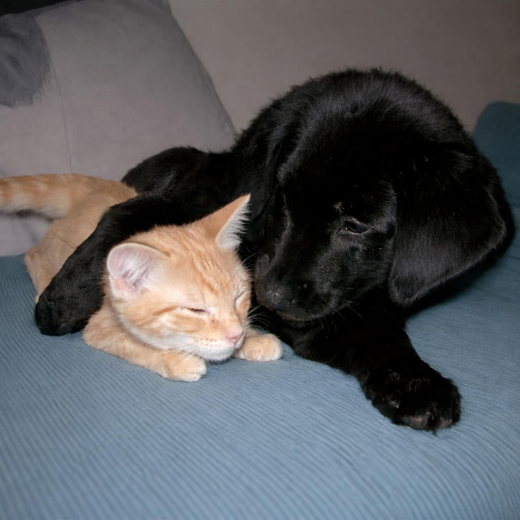 С этого момента Муха взяла шефство над рыжим. Она спала рядом, вылизывала его и клала на себя голову котёнка, словно поддерживая его.
