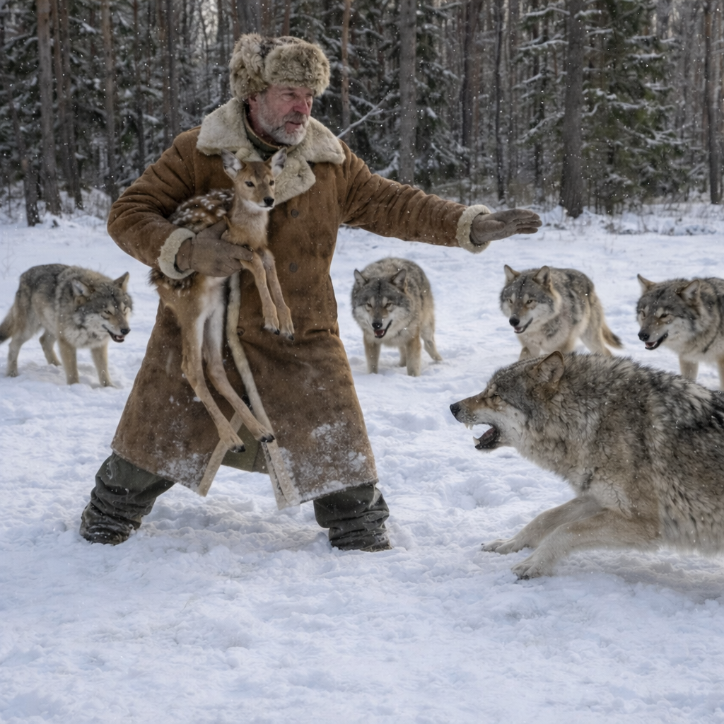 Волки скрылись, но для взвинченной матери ревущий мотор стал новой угрозой. Она резко развернулась и ринулась на машину, где сидел ничего не понимающий егерь. Степаныч застыл. Алексей осознал: сейчас случится беда. Собрав остатки сил, он кинулся вперед, падая почти под копыта разъяренного зверя.