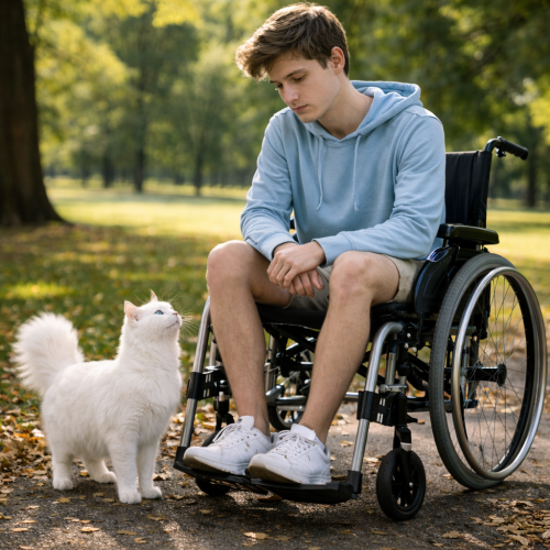 Дождавшись, когда юноша останется один, белоснежная кошка вышла из укрытия. Она подошла к инвалидному креслу и остановилась в нескольких шагах.