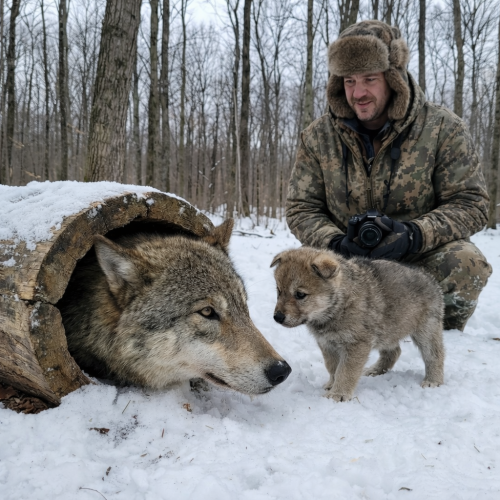 В расщелине могучего дерева, словно в ловушке, застряла волчица. Она выглядела истощённой и почти обречённой. Антон поднял карабин, чтобы прекратить мучения зверя, но вдруг заметил движение в снегу рядом. Возле матери сидел маленький волчонок, дрожащий от холода. То, что делал этот крошечный зверёк, пытаясь спасти самое близкое существо, глубоко потрясло старого таёжника.