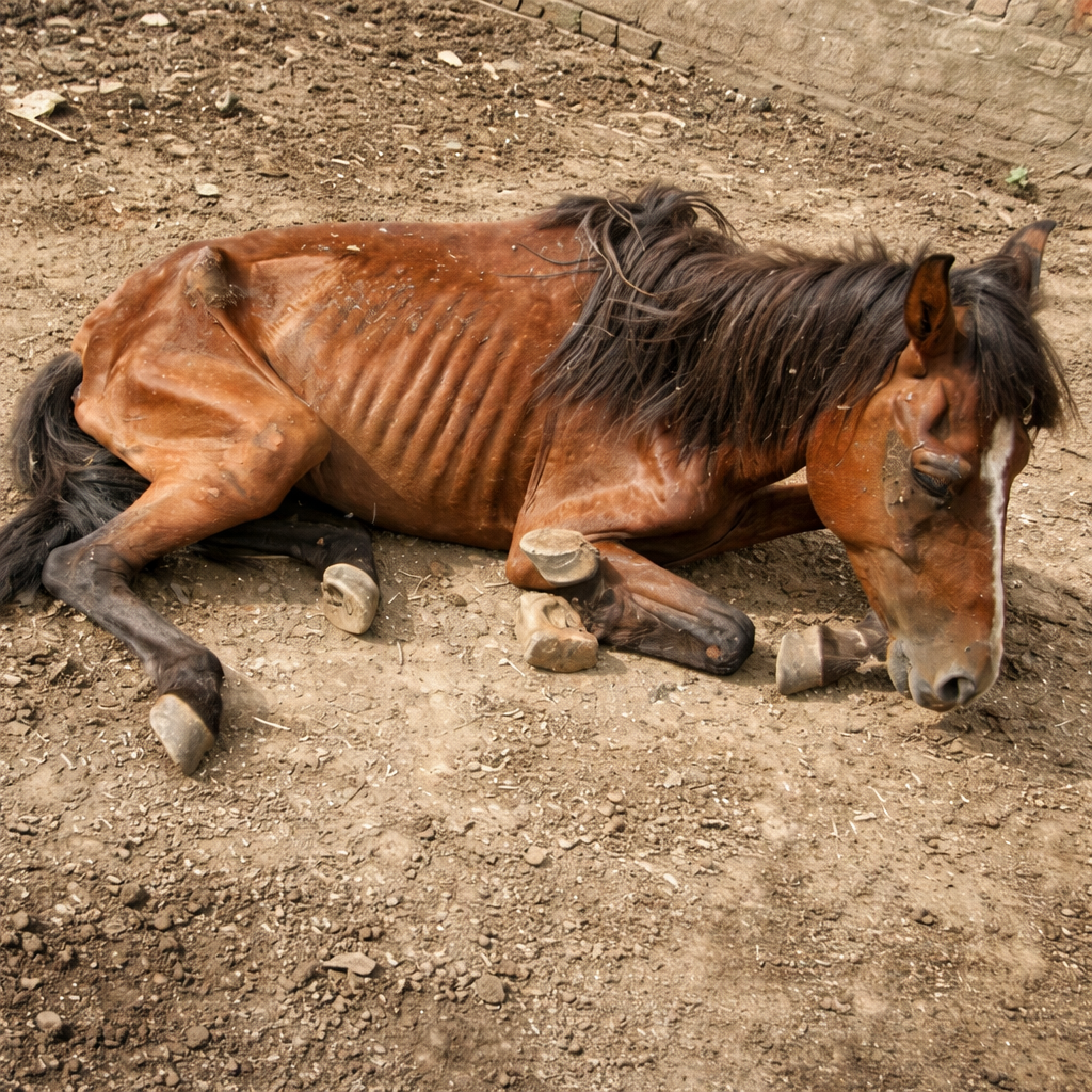 Лошадь выглядела совершенно истощённой.