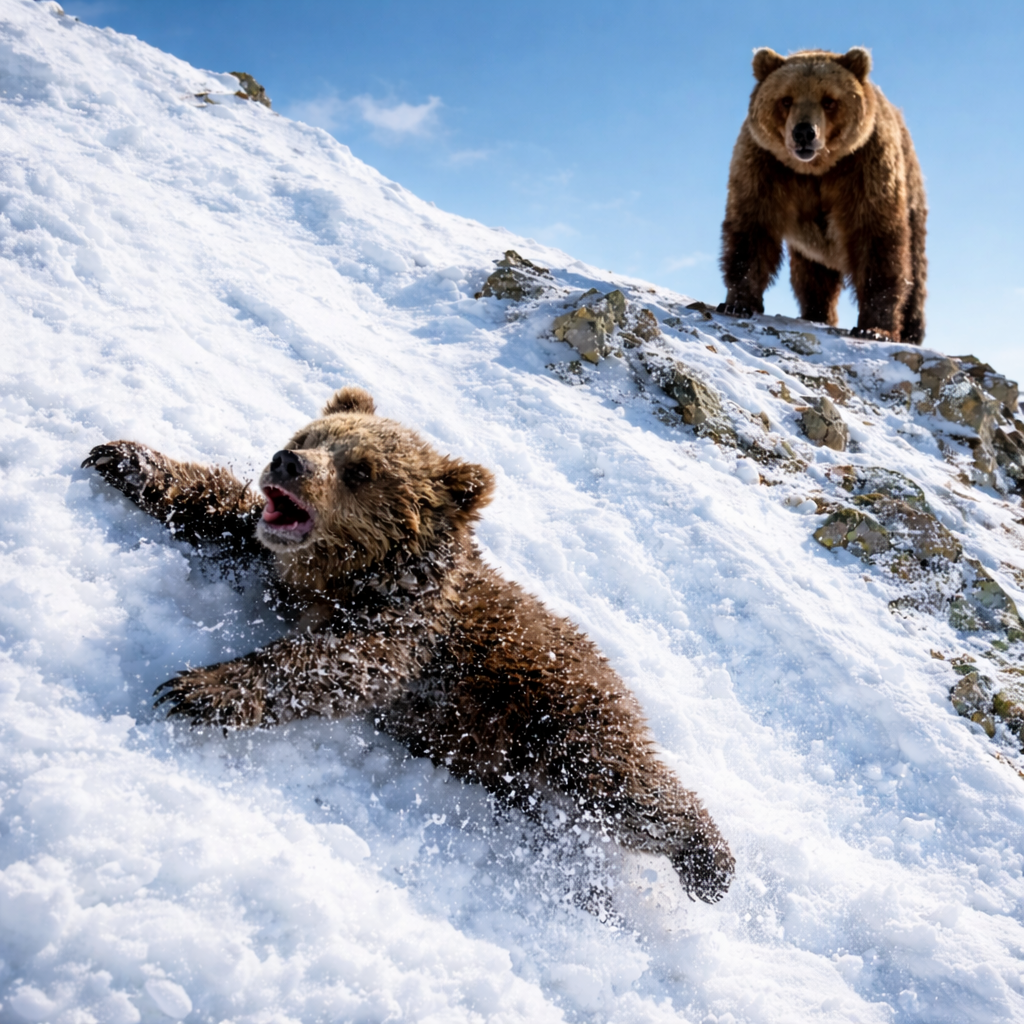 То, что они увидели, потрясло даже опытных путешественников. Ниже, на узком, крошащемся карнизе, едва держался крошечный медвежонок. Он из последних сил цеплялся когтями за камни. Было видно, что малыш ранен: одна лапа безжизненно висела, а на шерсти заметно темнела кровь. Каждый раз, когда он пытался подтянуться вверх, камни осыпались, и он опасно скользил к краю пропасти.