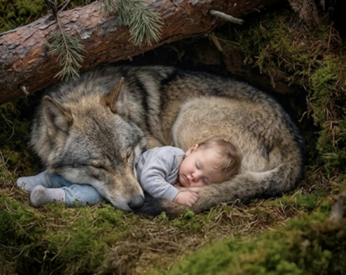 Под поваленной сосной, в укрытом мхом логове, началась странная и почти невероятная жизнь. Волк свернулся вокруг ребёнка, согревая его своим телом. Его дыхание и густая шерсть спасали малыша от смертельного холода.
