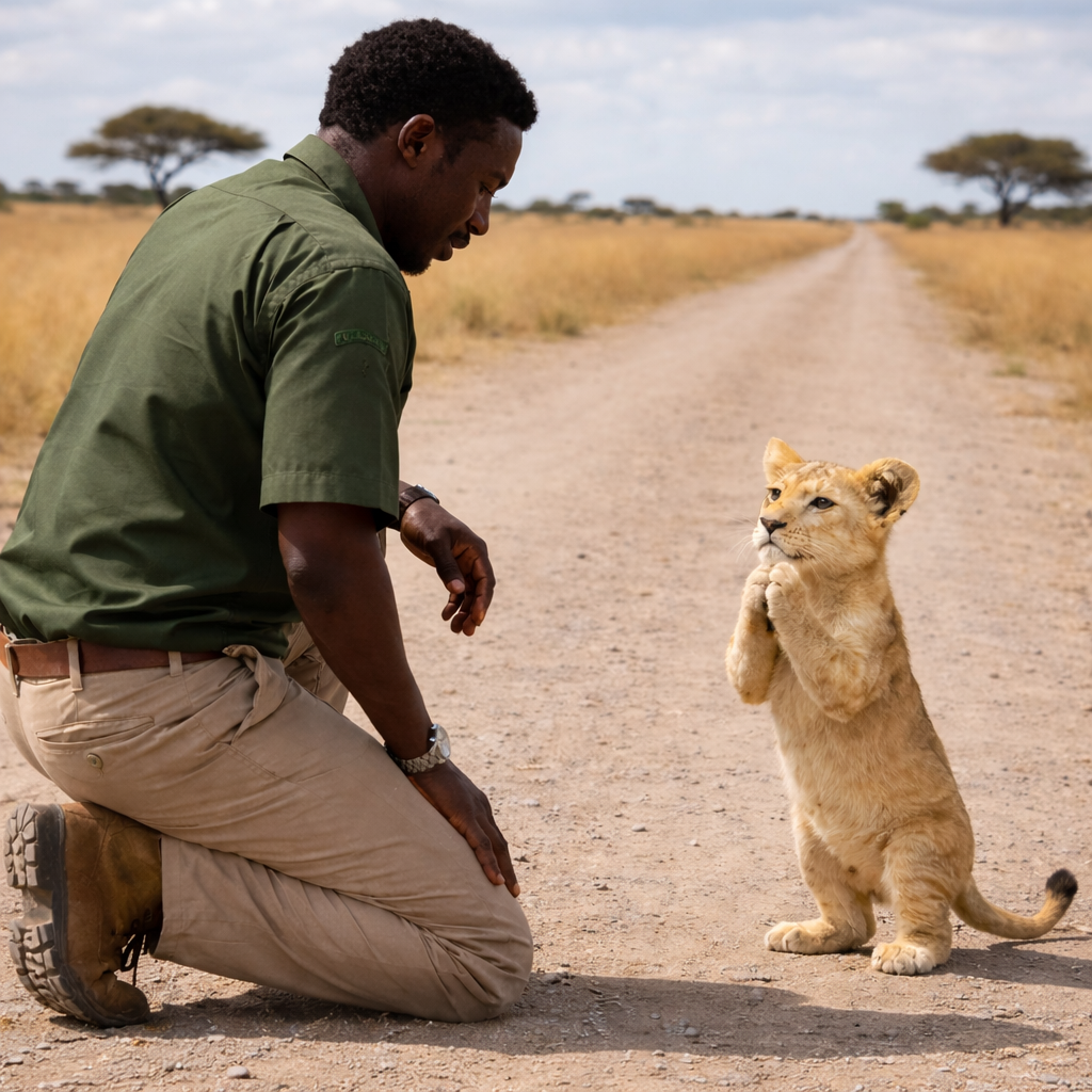 Передо мной оказался совсем маленький львенок. Вместо того чтобы убежать, он неожиданно встал на задние лапы, уперся передними в бампер и издал жалобный, почти человеческий крик. В его больших янтарных глазах читалась не просто тревога — это было отчаяние, словно он просил о помощи.
