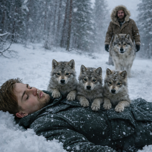 Когда Денис окончательно потерял сознание, из-под корней старой ели показались маленькие волчьи мордочки. Пятеро волчат, повинуясь природному инстинкту, прижались к его телу, стараясь согреть замерзающего человека своим теплом. Рядом стояла их мать — крупная волчица со шрамом на боку. В ее взгляде не было агрессии — лишь тревога и странная просьба о помощи. Именно эту необычную сцену застал старый лесник Прохор Кузьмич, вышедший на поляну.