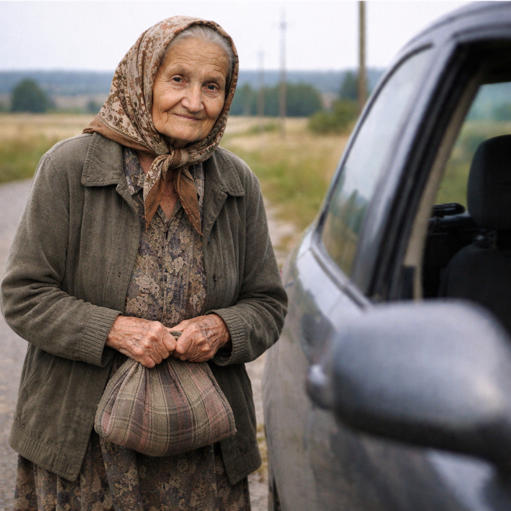 Вдруг сзади донёсся звук двигателя. Баба Таня обернулась: по дороге приближалась небольшая серебристая машина, чистая, аккуратная. Автомобиль поравнялся с ней и остановился. Стекло опустилось, и из салона выглянула молодая женщина — светловолосая, красивая, с мягким, добрым взглядом.