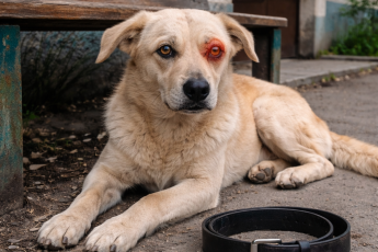 Увидев пса, лежащего возле лавки, он кинулся к нему. Заметил он и ремень, брошенный Натальей. Марс жалостливо посмотрел на хозяина затёкшим глазом…