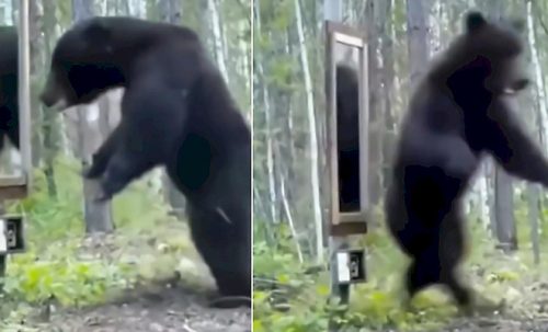 Медведь, судя по всему, отправлялся на поиски еды и не был готов повстречать столь необычный предмет на своем пути. Косолапый уже прошел мимо зеркала, но боковым взглядом заметил что-то необычное и тут же пришел в воинственное настроение.