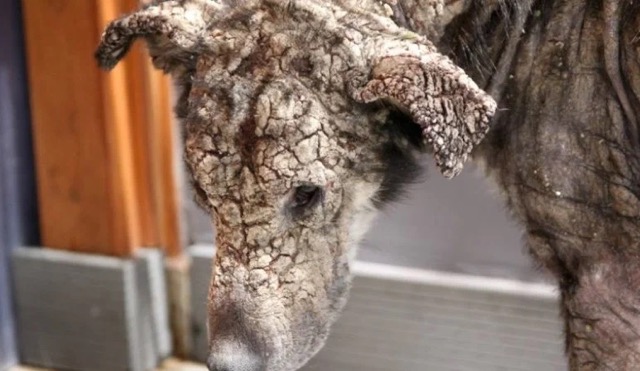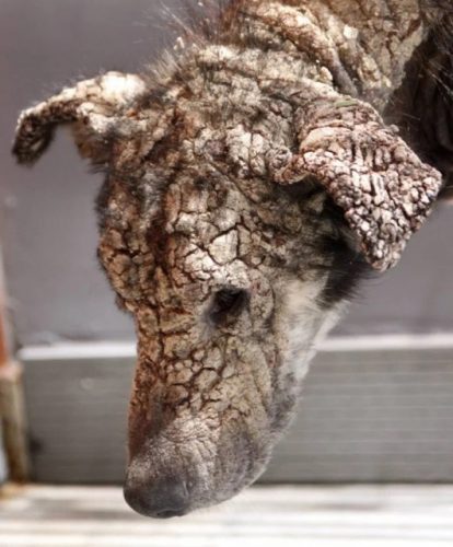 «Окаменевшие» участки кожи собаки были результатом чесотки. Ветеринары начали лечение физических проблем Петры, и ее здоровье постепенно улучшалось. Однако ее психологическое состояние продолжало вызывать беспокойство.