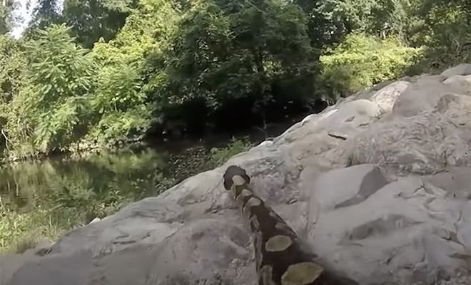 Экшн-камера была способна работать и под водой, поэтому запись не прекращалась, когда питон переплыл реку. Даже в условиях быстрого течения камера надежно держалась и продолжала съемку. На записи видно, как питон выходит на противоположный берег и продолжает свое движение в лесу, где он успешно охотится.