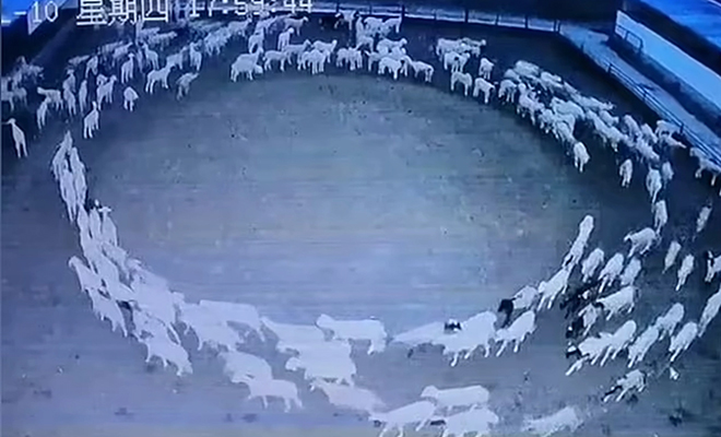 Фермер из Монголии решил установить камеры на своем поле, чтобы обеспечить безопасность своих животных. Просматривая записи с камер, он обнаружил, что все его овцы просыпаются одновременно и начинают двигаться в круговом направлении, двигаясь строго по часовой стрелке. Такое поведение продолжалось в течение 12 дней.
