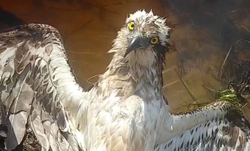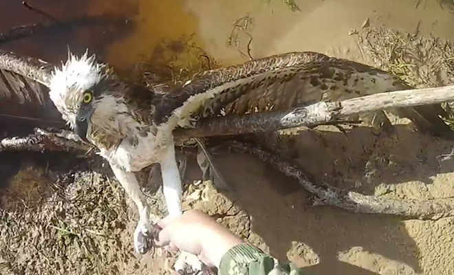 Предположительно, ястреб пытался схватить рыбу в реке, но вместо этого запутался в оставленной леске. Птица двигалась с большой скоростью, и ее переплетенные крылья, шея и когти были запутаны в узлах.