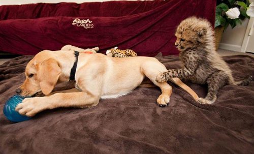 Гепарды пугливы по своей природе и предпочитают одиночное существование. Они намного легче переносят присутствие собак, чем встречу с другими своего вида. Это было замечено впервые сотрудниками зоопарка еще в 70-х.