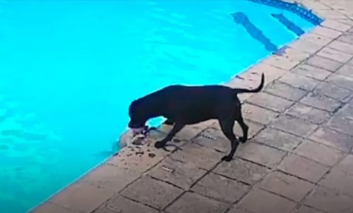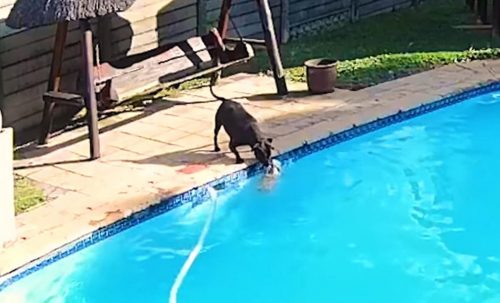 И вот, питбуль услышал лай и решил вмешаться. Он мгновенно прыгнул в воду, аккуратно подхватил упавшего щенка и вытащил его из бассейна.