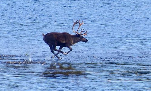 Тем временем лось заметил лодку и увеличил свою скорость. Вместо того чтобы двигаться вдоль берега, он направился прямо к рыбакам, пересекая речку в месте самом глубоком.