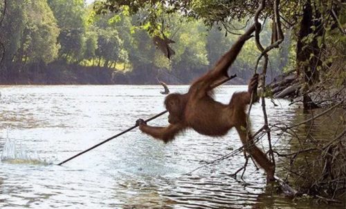 На Борнео исследователи обнаружили удивительное подтверждение теории эволюции, которое можно запечатлеть всего одним снимком. Недавно была сделана фотография орангутанга, демонстрирующая его умение и способность к обучению. Умное животное в течение недели тщательно наблюдало за рыбаками местными, а затем, впечатлив всех своей интеллигентностью, взяло кем-то забытое копье и мастерски повторило все движения рыбаков при ловле рыбы.