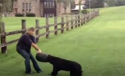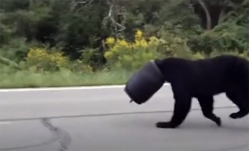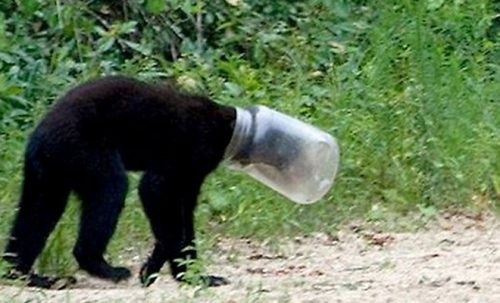 В лесу черный медведь обнаружил банку с остатками пищи и, попытавшись достать еду, застрял с головой внутри. Таким образом, он блуждал по лесу с банкой на голове, пока не был обнаружен людьми. Счастливое спасение пришло своевременно, и все происходящее было зафиксировано очевидцами на видео.
