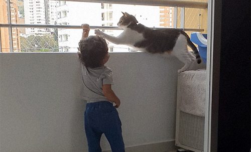 Однако, когда ребенок решил подняться чуть выше, чтобы получше рассмотреть окружающее, кошка почувствовала опасность. Видимо, она осознала, что внизу находится несколько этажей и решила упрекнуть малыша за его действия. Быстро протянув лапу, она одернула его, и мальчик не нашел другого выхода, кроме как вернуться в исходное положение.
