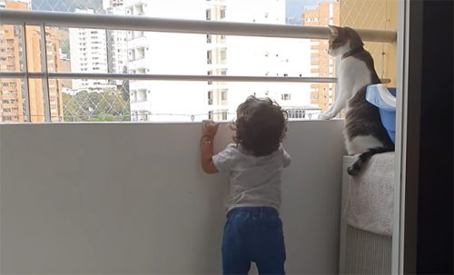 Интересный момент произошел с любопытным ребенком, который решил заглянуть за парапет балкона, чтобы увидеть, что происходит на улице. Рядом с ним сидела домашняя кошка, которая тоже наблюдала за улицей, но изначально не обращала внимания на малыша, когда он только слегка выглядывал за парапет.