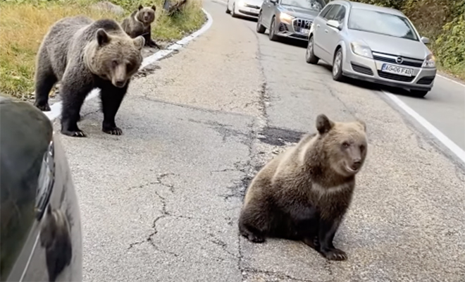 Группа туристов оказалась в дорожной пробке возле одного из известных заповедников Румынии. Водитель решил выяснить причину затора и обнаружил посреди дороги медведя. Хозяин леса решил взять перерыв и спокойно отдыхал прямо на оживленной трассе, игнорируя суету вокруг.