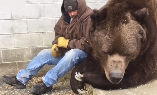 В питомнике, медведь начал проявлять признаки неважного настроения, сидя и понуро глядя в пол. Отметив изменение в поведении зверя, смотритель животных Ковальчик Джим сразу подошел к нему, чтобы утешить и придать поддержку.