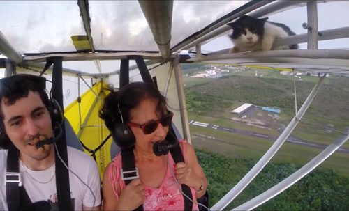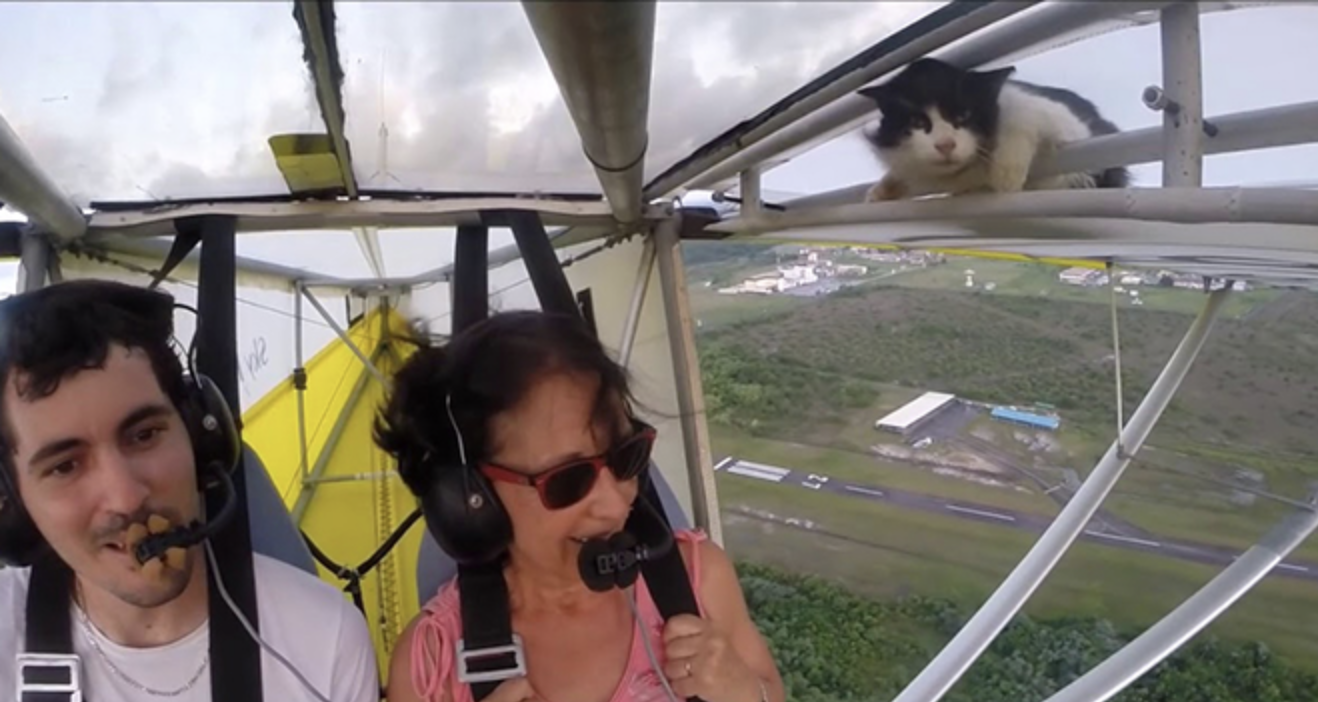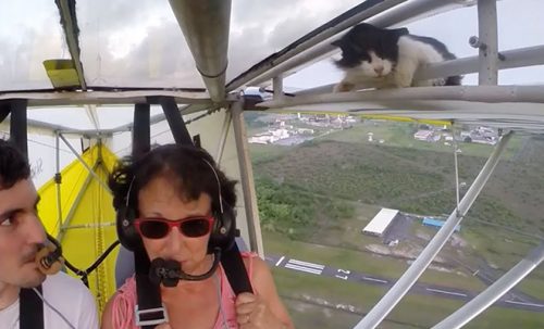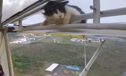 Первые 30 секунд полета прошли штатно, инициированный прокат туристки шел без проблем. Однако, внезапно пилот заметил движение над своей головой и обнаружил удивленного кота.