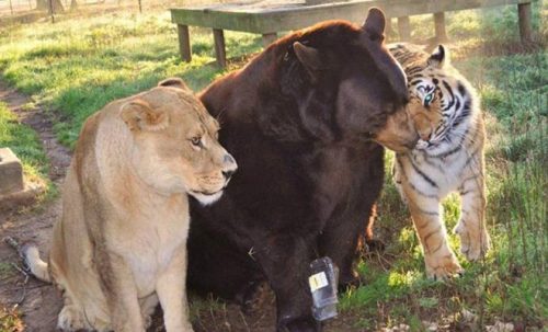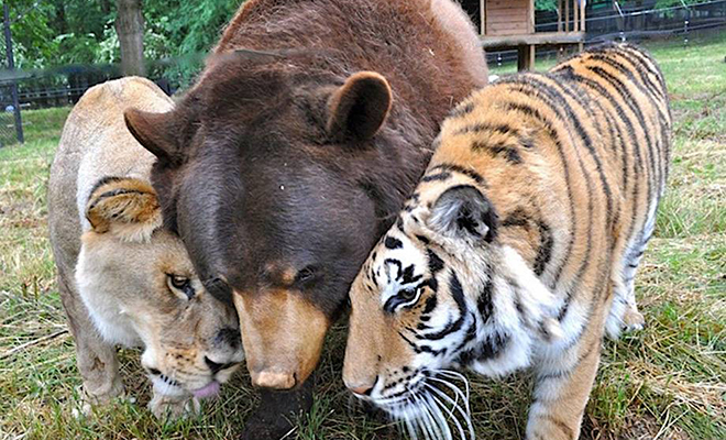 Примерно 15 лет тому волонтеры случайно обнаружила трех маленьких животных: медвежонка, тигренка и львенка, в браконьерском доме. Отсутствие заботы и внимания со стороны человека заставило волонтеров решить забрать животных и перевезти их в хороший питомник. К их удивлению, эти совершенно разные по типу животных, по истечении 15 лет, стали неразлучными друзьями, объединившись в одну стаю, состоящую из Балу, Шерхана и Лео.