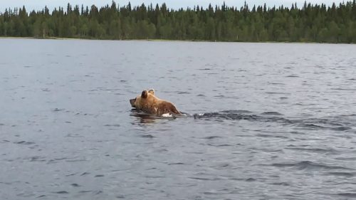После этого медведь сориентировался в пространстве, доплыл до берега и убежал в лес. Похоже, что он больше не спешит идти к людям в ближайшее время.