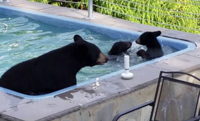 Владельцы дачного дома в одном из живописных районов решили устроить вечеринку у себя у бассейна. Они только что наполнили его водой и отошли всего на несколько мгновений, чтобы забрать продукты и принадлежности для пикника. К их великому удивлению, по возвращении они обнаружили, что их бассейн уже занят – там купались медведица и ее детеныши.